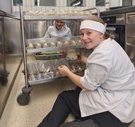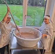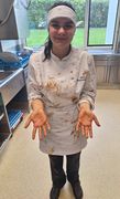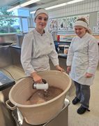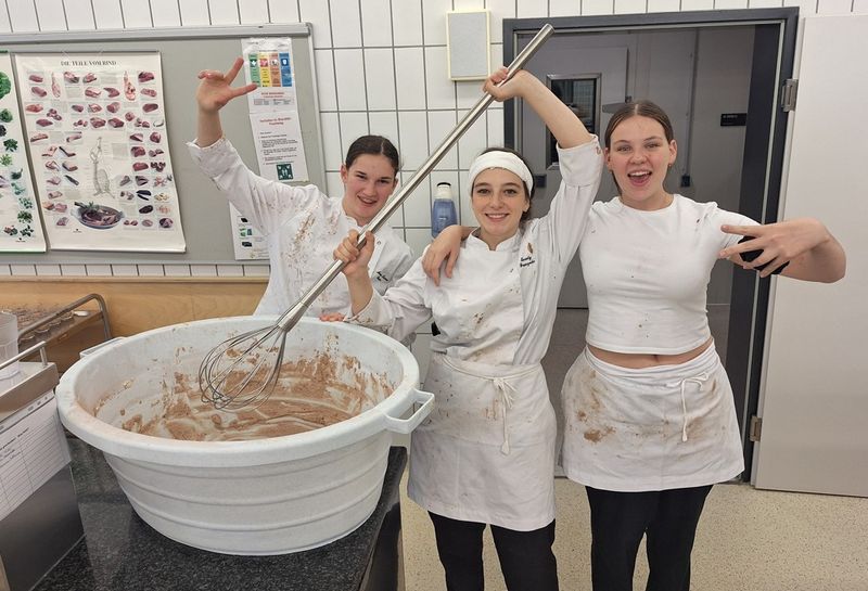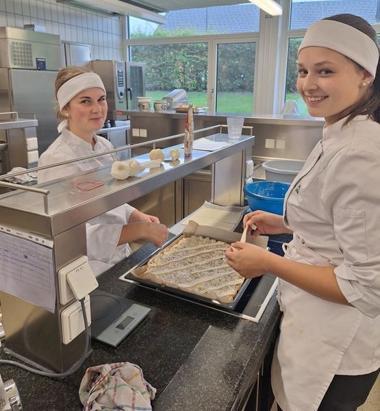 Die FH1 Schülerinnen haben fleißig kleine Brötchen gebacken und die FH2 Schülerinnen 12 Blechkuchen und knapp 30 Liter Schokomousse hergestellt und vorbereitet für die Erntedankfeier am Montag dem 20.10.25