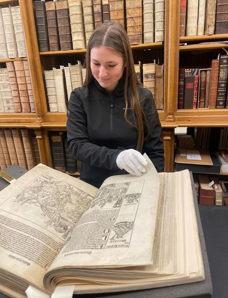 Etwas später konnten wir die Stiftsbibliothek besichtigen. Dort waren wertvolle alte Bücher, Handschriften und Frühdrucke ausgestellt, die teilweise vor dem Jahr 1500 entstanden sind. Diese Ausstellungsstücke vermittelten einen eindrucksvollen Einblick in die Geschichte des Buchdrucks und des schriftlichen Kulturerbes.