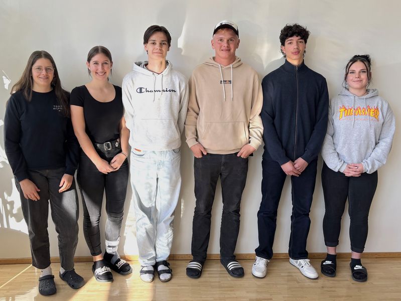 Foto 2 v.l.n.r.: Ann-Sophie Obwegeser (Ersatzmitglied), Martina-Aline Fitz (Ersatzmitglied), Aaron Fuchs (Ersatzmitglied), Lorenz Tschann (2. Stellvertreter), Aurelio Aistleitner (Stellvertreter), Tabea Albrecht (Schulsprecherin)