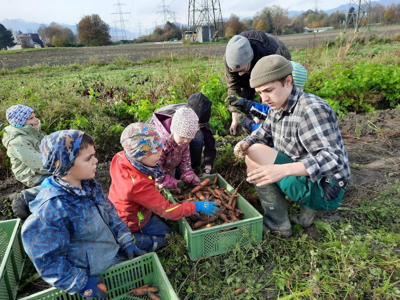 Am vergangenen Freitag durften die Hofküken mit den Schülern der 1C Praxisgruppe C Karotten ernten.